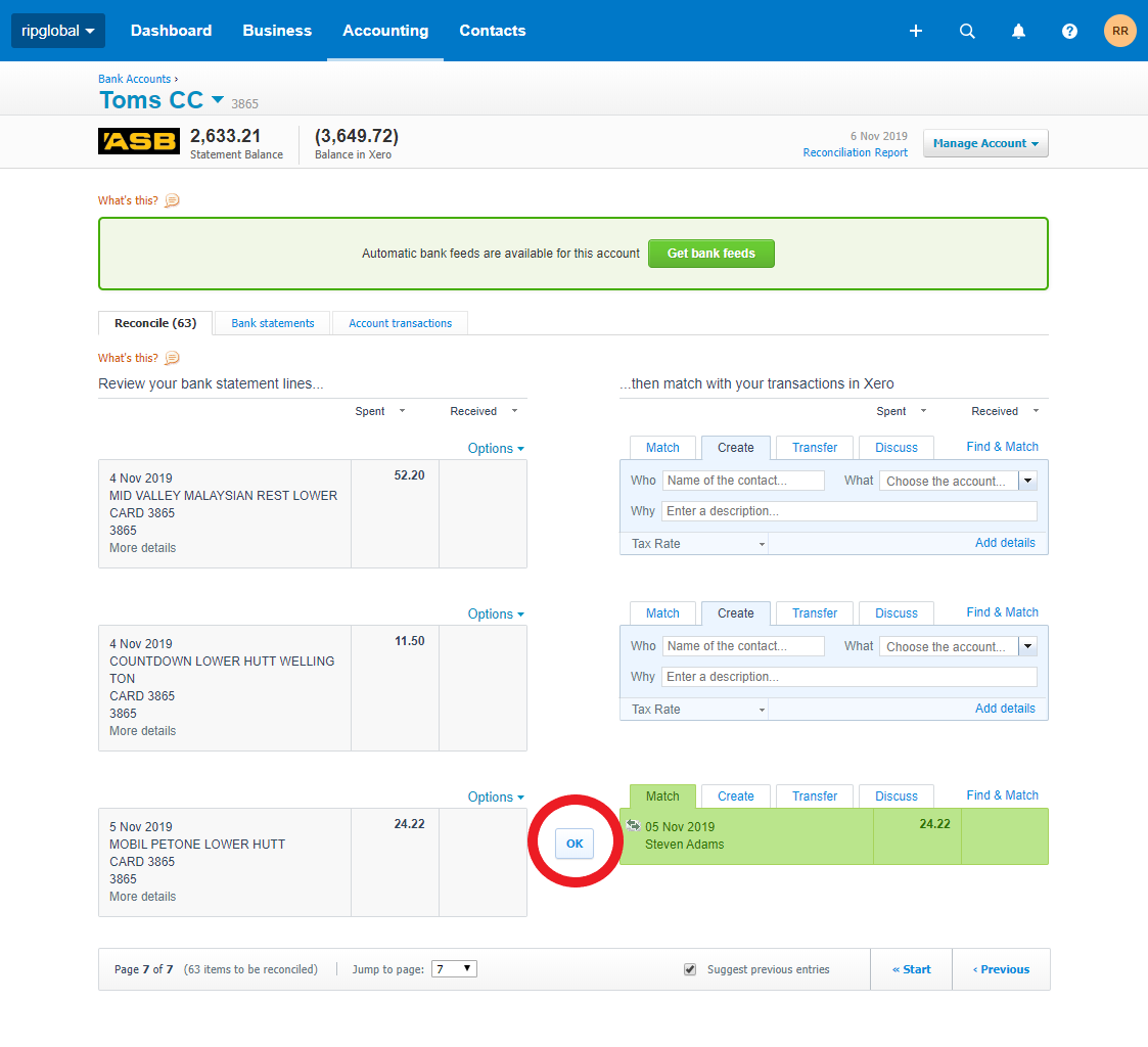 Xero users will be able to go into the Reconcile tab within that Bank Account, and see the matching RIP-generated expense transactions down the right hand side of the screen, lining up with the Bank Account transactions on the left hand side of the screen. The Xero user can click the OK button in the centre of the screen to confirm reconciliation of the transaction.