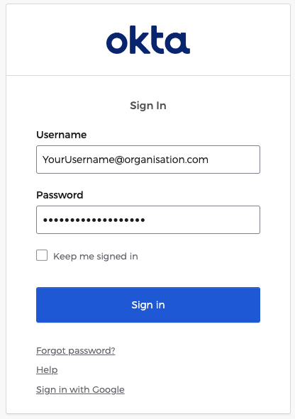 ...then either way, you must click or tap on the "Sign in with Okta" button only and ignore any other options, should they be given. You will now see an Okta authentication screen which will look something like this: