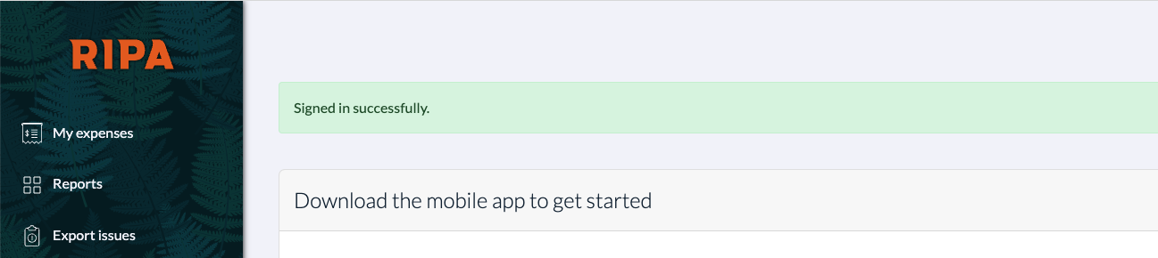Fill out your usual Okta sign-in credentials for your existing account under your Okta organisation (if you are unsure about these, please contact your manager or company administrator for help). Then click or tap on "Sign in". This will establish a connection between your Okta account and RIPA account. You will now also be signed into RIPA Expenses: